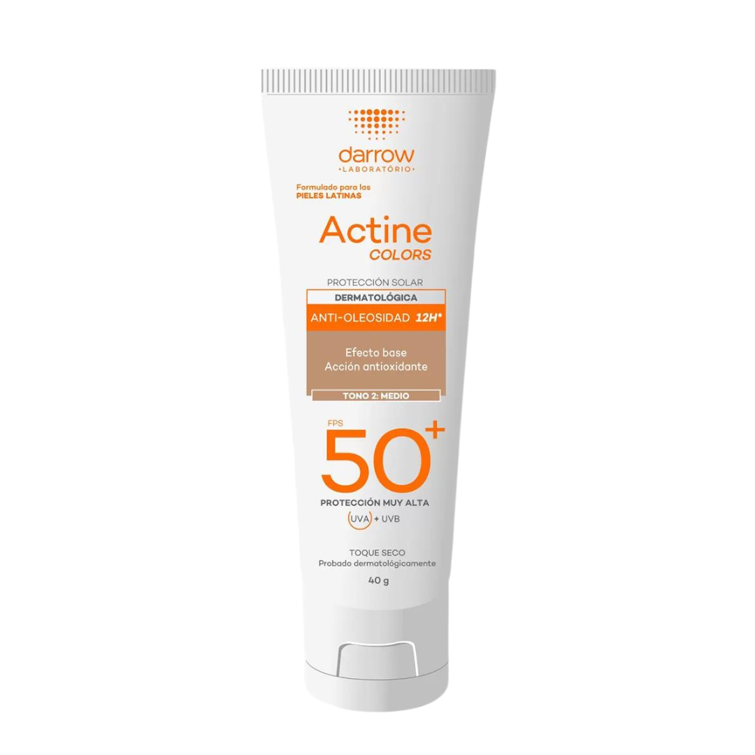 Darrow Actine Colors Medio FPS50 es un protector solar con color medio que ofrece una alta protección contra los rayos UVB y UVA mientras unifica el tono de la piel. Su fórmula no comedogénica y matificante es ideal para piel grasa y con tendencia acneica, proporcionando un acabado natural y sin brillos.